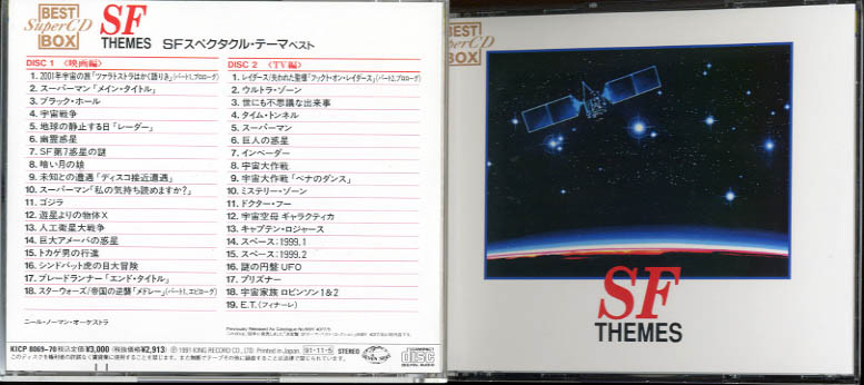 TITLE: SF THEMESUFO REFERENCE: Track 16 Disc 2 UFO Main Title (Not Original Barry Gray's Music) Re-issue of the K19Y 4077/8 CODE: KICP 8069-70 (2 CD) MANUFACTURED: KING RECORD CO.,LTD. / JAPAN PRODUCTION YEAR: 1991 |