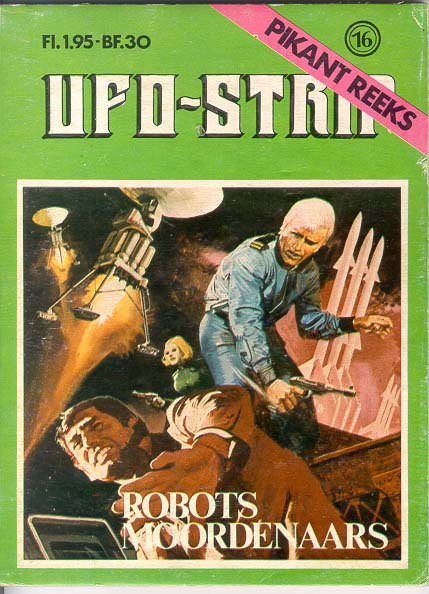 TITLE: UFO-STRIP "ROBOTS MOORDENAARS"UFO REFERENCES: Similar Straker on Front Cover; UFO, Straker's Car and SHADO Mobiles on various pages CODE: Pikant Reeks 16 AUTHOR: Edifumetto Italy SIZES: mm. 130x176 FORMAT: Papercover - p.114 MANUFACTURED: EDIFUMETTO SPA / ITALY-HOLLAND PRODUCTION YEAR: 1973 |