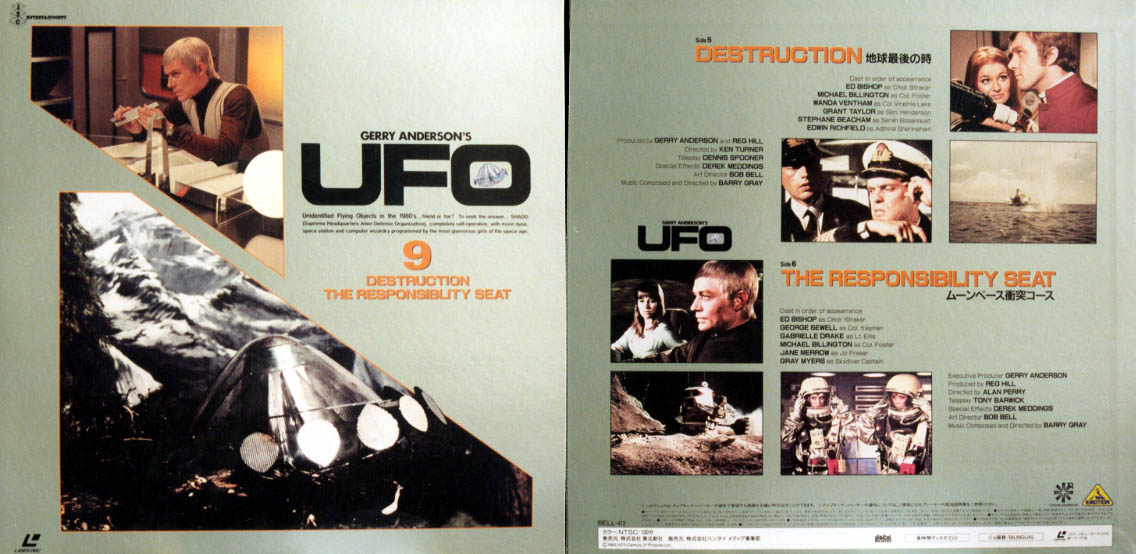 TITLE: GERRY ANDERSON'S UFO PART 2 COLONEL PAUL J. FOSTER ITC MEMORIAL BOX - VOLUME 9 "DESTRUCTION" / "THE RESPONSIBILITY SEAT"CODE: BELL 413 - VOLUME 9 MANUFACTURED: TOHOKUSHINSHA EMOTION / JAPAN FORMAT: LD / COLOR/NTSC BILINGUAL / CLV PRODUCTION YEAR: 1992 |