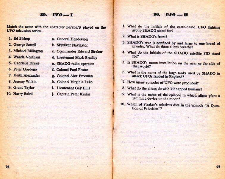 TITLE: THE UFO MOVIE QUIZ BOOKUFO Reference: UFO Quiz (p. 96-97) CODE: 0-451-08258-3 175 AUTHOR: Jeff Rovin SIZES: mm. 106x177 FORMAT: Papercover - 166 p. MANUFACTURED: SIGNET / THE NEW AMERICAN LIBRARY, INC. / USA PRODUCTION YEAR: 1978 |